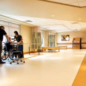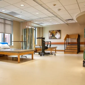 Our large rehabilitation gym is located on the Transitional Care Unit providing Physical, Occupational, and Speech Therapy, and allowing the rehabilitation staff to work more closely with the nursing staff in meeting the therapy goals of each patient.